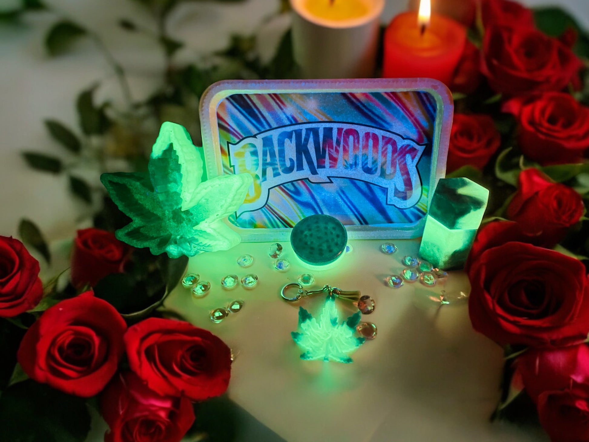 Show off your skills and make your friends eyes widen, when you pull out your custom resin rolling tray set. Set comes with rolling tray, stash jar, grinder, ash tray and matching carrying bag. Add a little extra wow when you choose the glow in the dark option of green or blue.