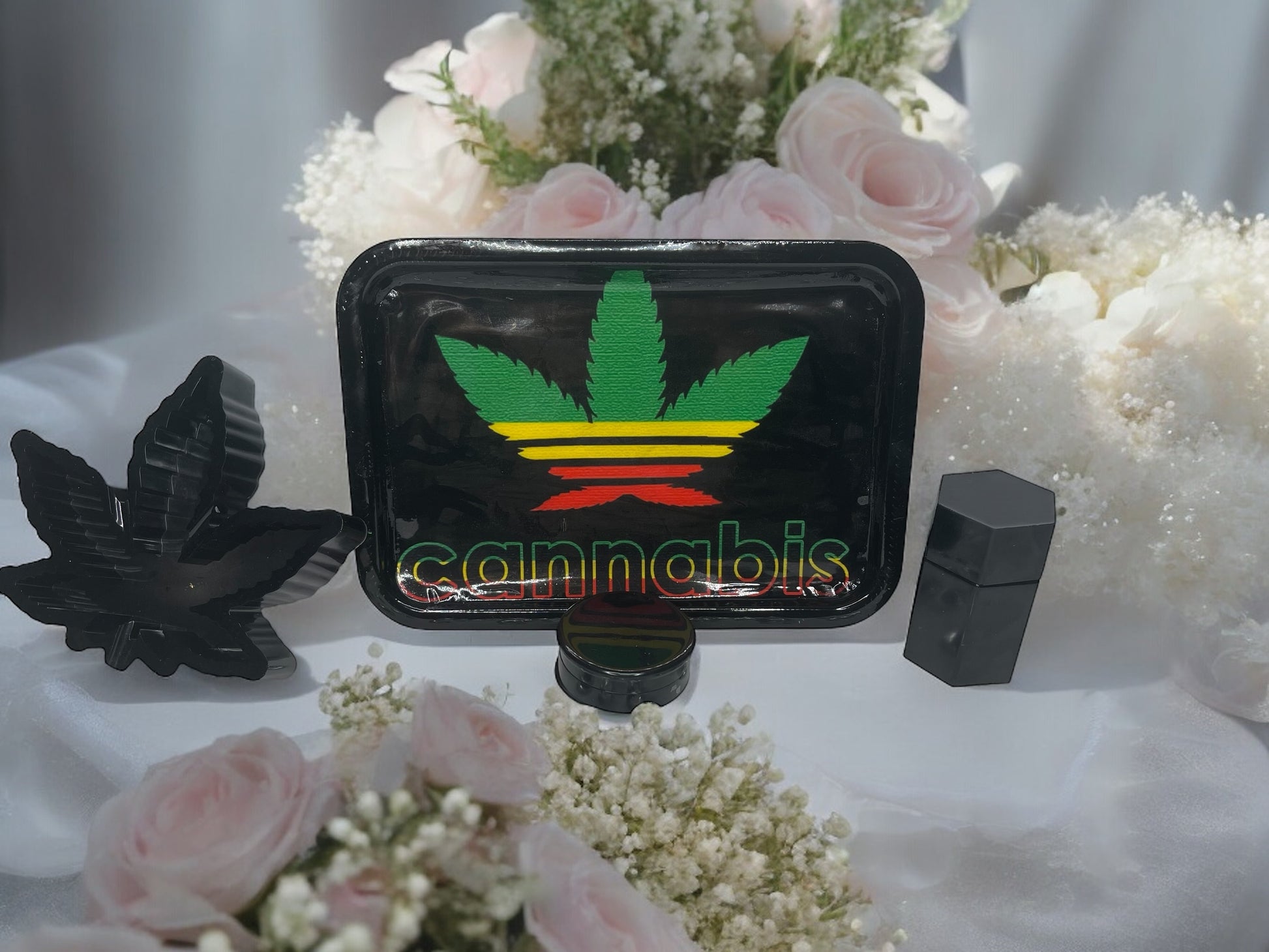 Get your hands on this custom cannabis resin rolling tray set. Set includes rolling tray, stash jar, ash tray, grinder and matching carrying bag. You can choose tray background color and the color of the accessories. Add a little more dazzle when you choose the glow in the dark option. Just specify colors desired in the personalize box below.