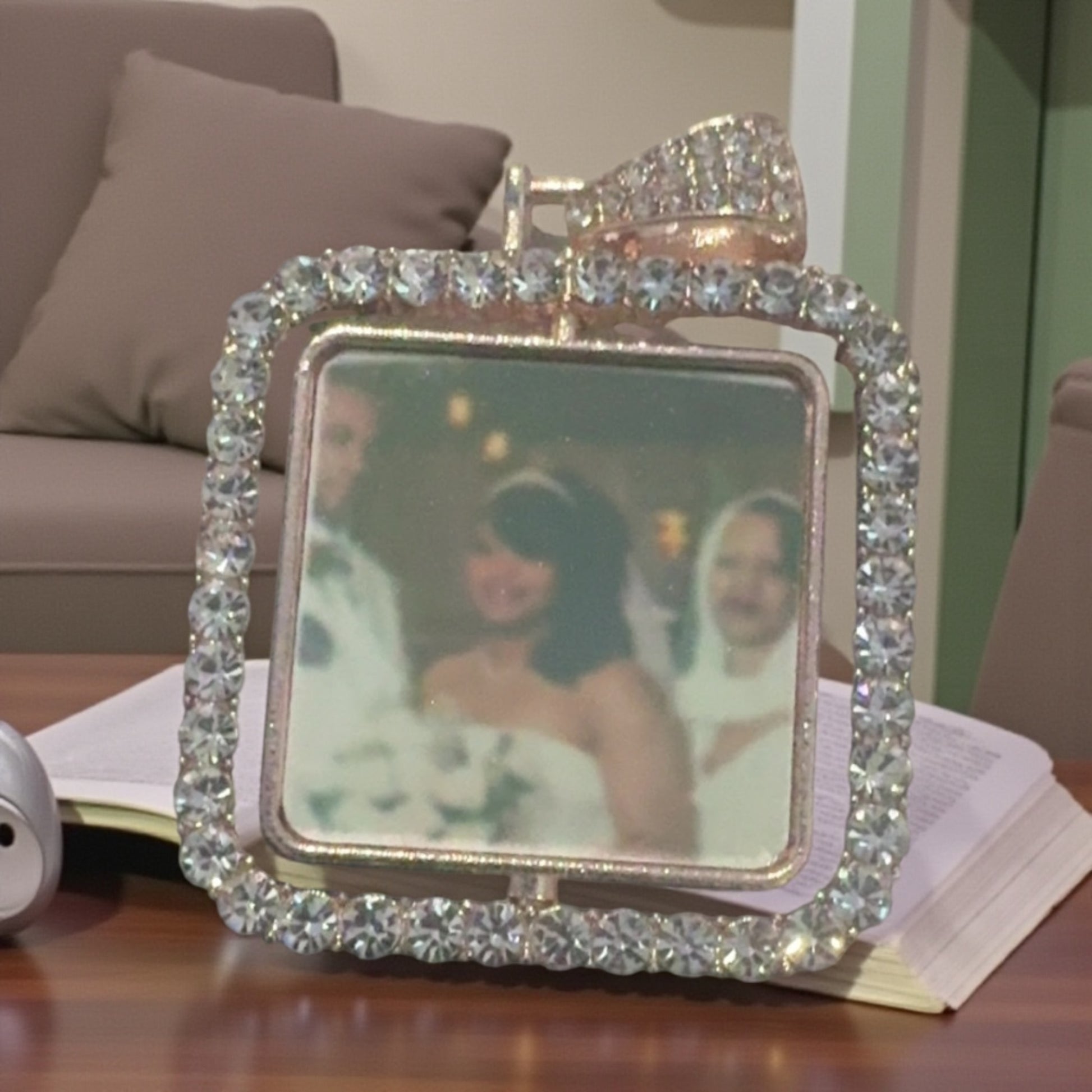 Represent your favorite photos in style with this custom double sided picture necklace. Necklace comes in square and in 3 separate colors adorned with diamond trim. Submit 1 photo for both sides or 2 photos. Also comes in heart shape in silver only.