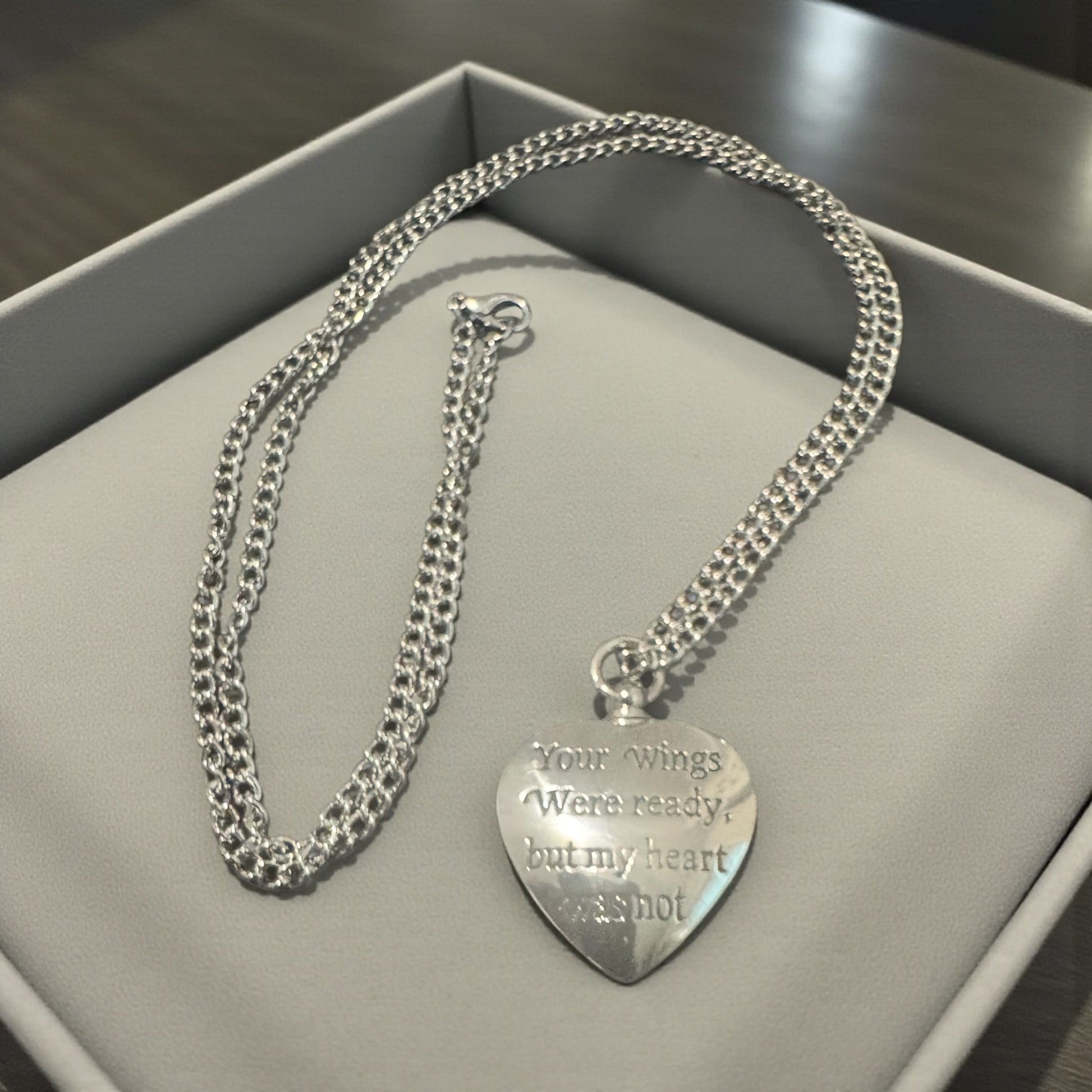 Look at this beautiful custom picture urn necklace. Carry your loved one with you close to your heart with a message that reads "your wings were ready my heart was not". Just submit the image you want to adorn this necklace below.