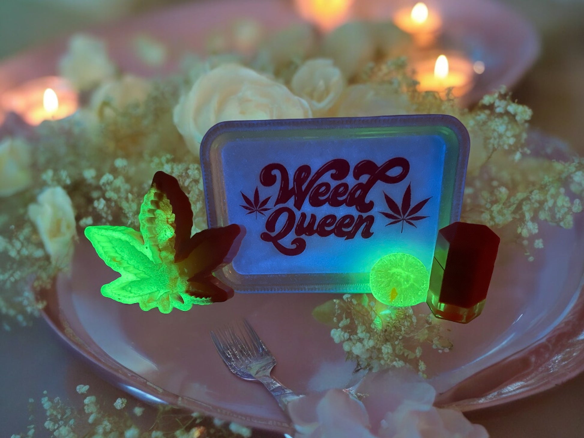 Get your hands on this custom made resin rolling tray set. Can be changed to say weed king. Set includes rolling tray, stash jar, ash tray, grinder and matching carrying bag. Add a little more dazzle when you choose the glow in the dark option of blue or green. Just specify you words and colors wanted in the personalize box below.